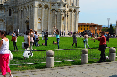 We made a day trip to Pisa. Pictures of the famous leaning tower and immediate surrounding area would lead you to believe that the entire city is adorned with white polished marble sparkling as one might envision heaven to be. Au Contraire, Mon Frère. What you see in these photos is the only section of Pisa that looks like this. From our driving tour it appeared as if the tower and two adjacent buildings were the beginning of some amazing project that was abandoned. The rest of the city is dark and old. We found that the tower was about all we wanted to see in Pisa and that was fine because it was not a disappointment. It's gorgeous and it leans something fierce. Before 2001 it leaned about 5.5 degrees and after some restoration it now leans about 3.99 degrees (that means the top is almost 13 feet off from being perfectly vertical.) It really looks like it's going to topple over at any minute. They have a strict age limit to climb up the tower (not that we wanted to anyway) so we just walked the perfectly manicured lawn and took our silly pictures holding up the tower and watched other people's acts of acrobats as they too took these ridiculous photos. They also have a unique fountain with three very large cherubs that we admired for some time. The tower is a free standing bell tower for the cathedral it stands next to. It took 177 years to complete the tower. Work began in 1173 and it only took 5 years for the subsoil and flawed designed to cause it to lean.